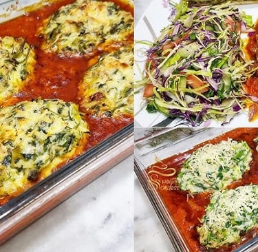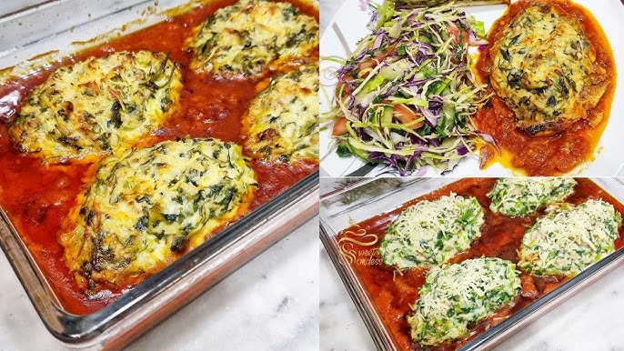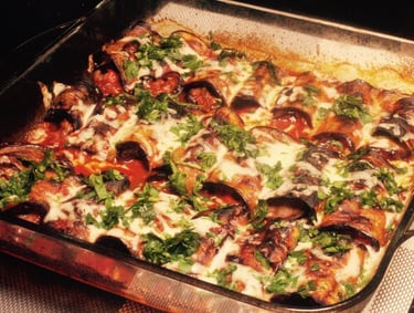 8- Pour tomato sauce into the bottom of a baking dish, then arrange the stuffed eggplant rolls on top.