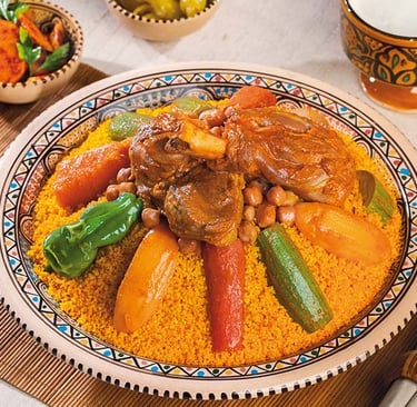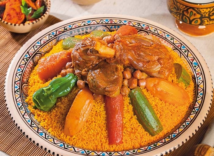 Once everything is cooked, pour the broth over the couscous and garnish it with the meat and vegetables.