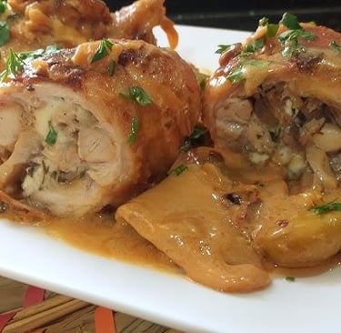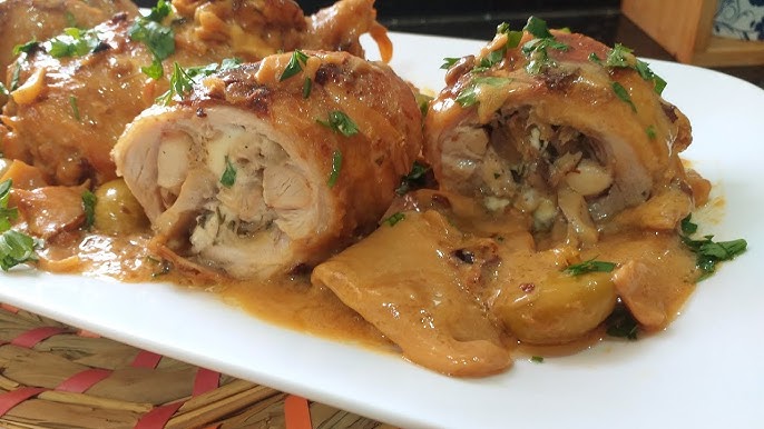 8. Repeat until all the chicken thighs are stuffed. Arrange the stuffed chicken thighs in a lightly greased ovenproof dish.