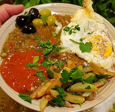For the couscous broth: Heat a little oil in a pan and fry a green pepper. After removing the peppers, add 3 small onions and pieces of lamb to the same oil, stirring occasionally. Then add 2.5 tablespoons of tomato paste and the spices (1 tablespoon of red chili powder, salt, black pepper, turmeric, a pinch of coriander, and caraway seeds) along with a little water. Sauté, stirring occasionally. Next, add water (approximately 2 liters or slightly more), chickpeas, and carrots, and let it simmer for 30 minutes. After that, add the vegetables (potatoes and pumpkin) and continue cooking until all the ingredients are tender.